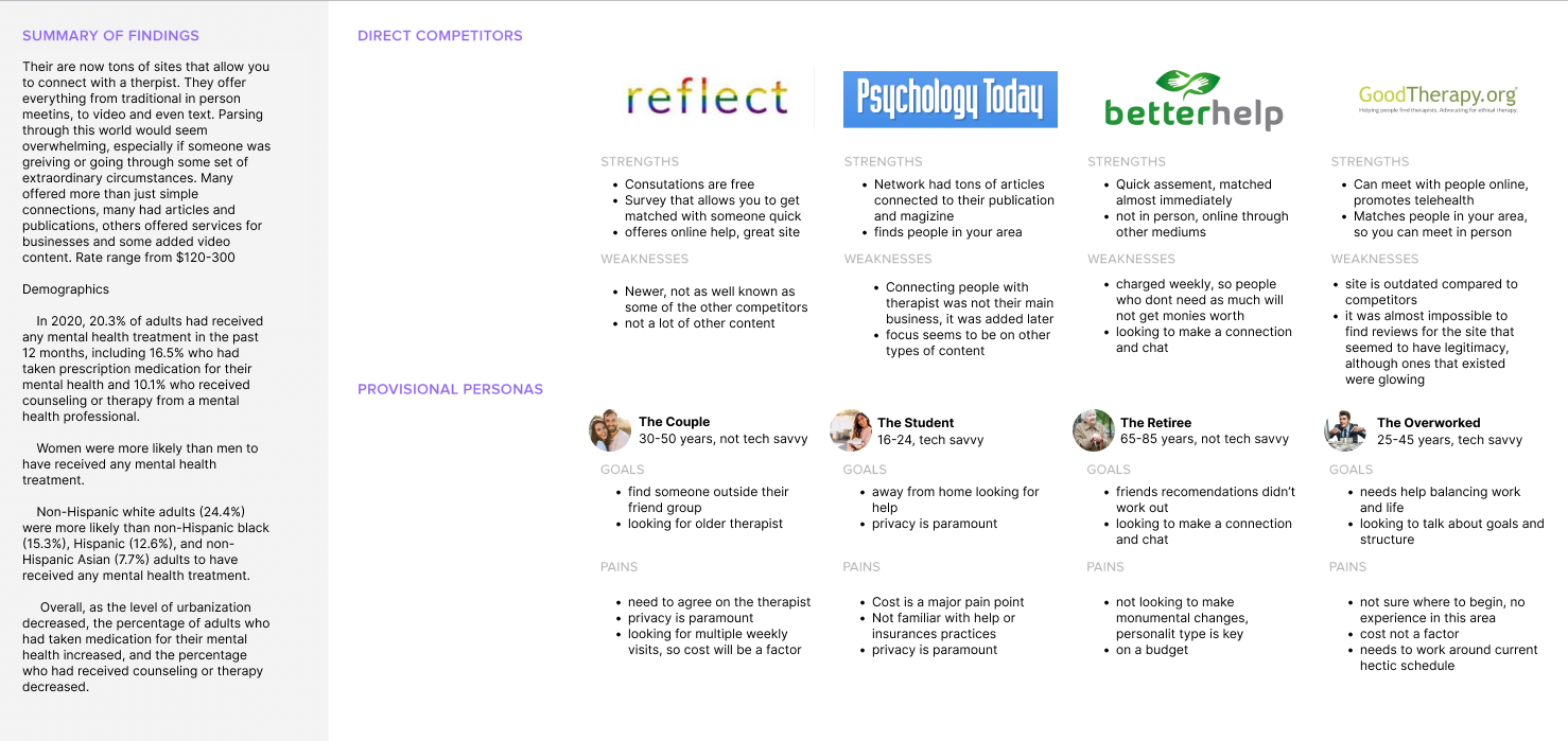 Therapy has been changing rapidly in the last couple of years. expedited by the pandemic, more people are not only comfortable communicating online, but stresses and impacts created by Covid-19. Below looks at some of the big players and how they are providing services, as well as personas of some potential users.